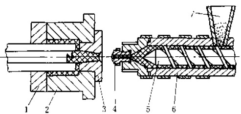 塑料注射模成形塑件过程如图所示(图中:1-动模脱料板,2-定模,3-浇口套,4-喷嘴,5-注射机螺杆,6-料筒,7-料斗,8-动模型芯,9-拉料杆)。