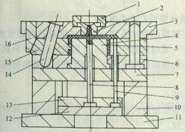 如图1(图中:1-定位环2-浇口套3-定模板4-塑件5-型芯6-动模固定板7-支承板8-拉料杆9-顶杆10-垫块 11-动模座板 12-顶出板 13-顶杆固定板14-斜导柱 15-滑块 16-锁紧楔)所示,利用开模力使斜导柱带动滑块向外滑移而抽出型芯,而与塑件分离。