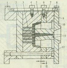 图1所示为定模设有顶出装置的注射模(图中:1-模脚,2-动模垫板,3-成型镶块,4-螺钉,5-动模,6-螺钉,7-脱模板,8-拉板,9-定模板,10-定模底板,11-型芯,12-导柱),在定模一侧设有脱模板7,开模时由设在动模侧的拉板8带动,将塑件从定模型芯11上强制脱下。