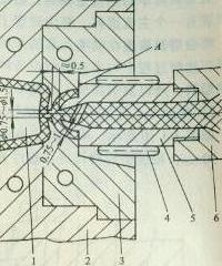图1所示(图中:1-型芯,2-定模,3-浇口衬套,4-加热圈,5-延伸式喷嘴,6-注射机料筒)为塑料层绝热的延长式喷嘴。喷嘴与模具之间有一环型接触面,它既起密封作用,又是模具的承压面(见图中A部),此面积不宜太大,以减少散热。浇口处的间隙,厚约0.5mm,浇口以外的绝热间隙以不超过1.5mm为宜,以免注射时推力太大,造成溢料现象。浇口直径一般为0.75~1.5mm。这种喷嘴与井式喷嘴相比,浇口不易堵塞,应用范围较广,由于绝热间隙存料,故不宜用于热稳定性差,容易分解的塑料。