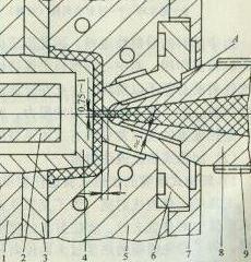 图2所示(图中:1-型芯固定板,2-型芯冷却管,3-脱模板,4-型芯,5-定模型腔板,6-浇口衬套,7-定模座板,8-延伸式喷嘴,9-加热圈)为空气绝热的延长式喷嘴,喷嘴与模具之间,浇注套与型腔板之间,除必要的定位、接触部分之外,都留出厚约1mm的间隙,此间隙为空气所充满,也起绝热作用。由于与喷嘴接触的浇口附近型腔壁很薄,为防止被喷嘴顶坏或变形,故喷嘴与浇注套之间也应该设置环形支承面(图中A处)。