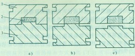 下图所示(图中:1-定模,2-塑件,3-动模。图a注射结束;图b动模移动,塑件发泡;图c开模。)是最简单的低发泡成型法,模具由动定模组成,动模随注射机移动一段距离使塑件发泡,由于是型芯的移动,所以在塑件的侧面有线状的条纹。