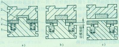 下图所示(图中:1-定模,2-塑件,3-活动板,4-弹簧,5-动模。图a注射结束;图b动模移动,塑件发泡;图c开模)的结构增加了一块板,发泡时使分型面不分开,因此消除了塑件侧面的条纹,使表层得到光滑的表面。